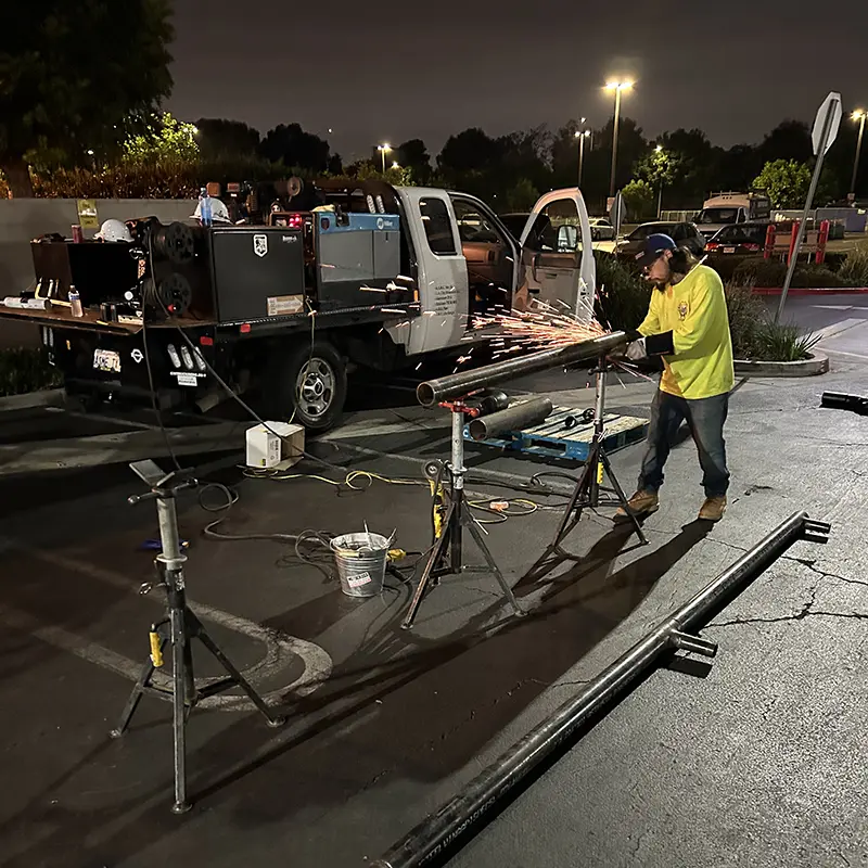 Our mobile welding trucks aren’t just vehicles—they’re complete fabrication shops on wheels. Each unit carries welding equipment for TIG, MIG, Stick, and flux-core processes, along with cutting tools, safety equipment, and materials for immediate repairs. Whether you need emergency pipe repairs during a weekend shutdown or planned fabrication work at a remote location, we arrive ready to work.